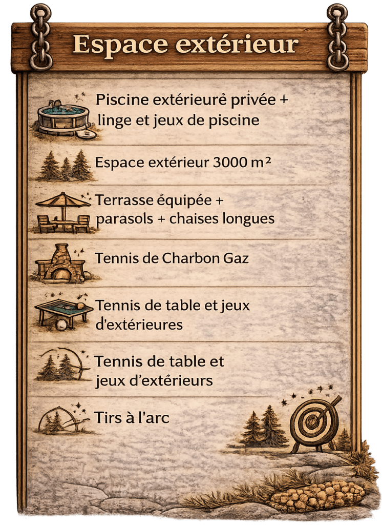À l’extérieur, vous profitez d’une terrasse avec table et barbecue, d’une pelouse, ainsi que de plusieurs activités sur place : piscine privée, table de ping-pong et tir à l’arc.