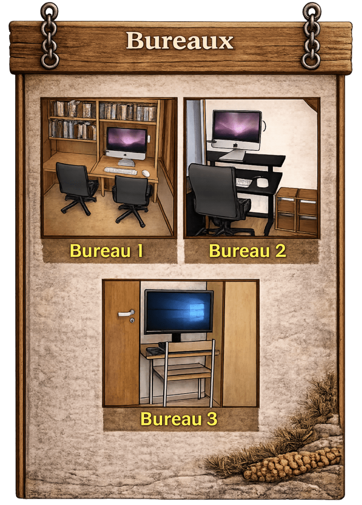 Étage intermédiaire – Lits à étage 90×180, 2 duvets et 2 coussins, avec duvets supplémentaires et toute la literie nécessaire. Bibliothèques, Bureau, iMac, internet. BD, livres pour enfants, jeux de société et pour enfants.